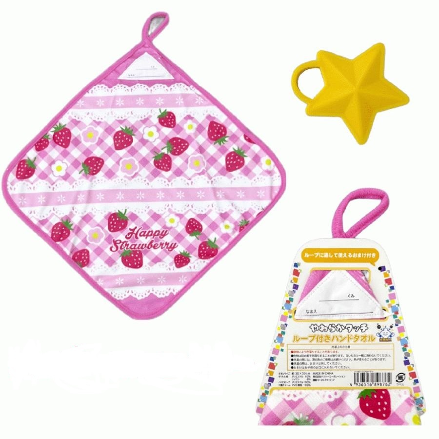 - ループ付き ハンドタオル やわらかタッチ ストロベリー柄 チャーム付き いちご柄 子供用タオル キッズタオル