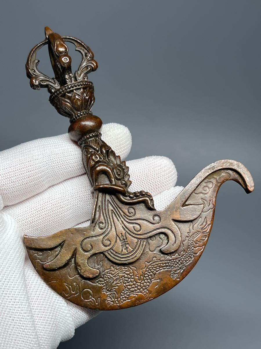 - 中国古美術 古銅 細工 チベット 密宗密教 法器 金剛杵 仏具 辟邪 斧形 竜紋