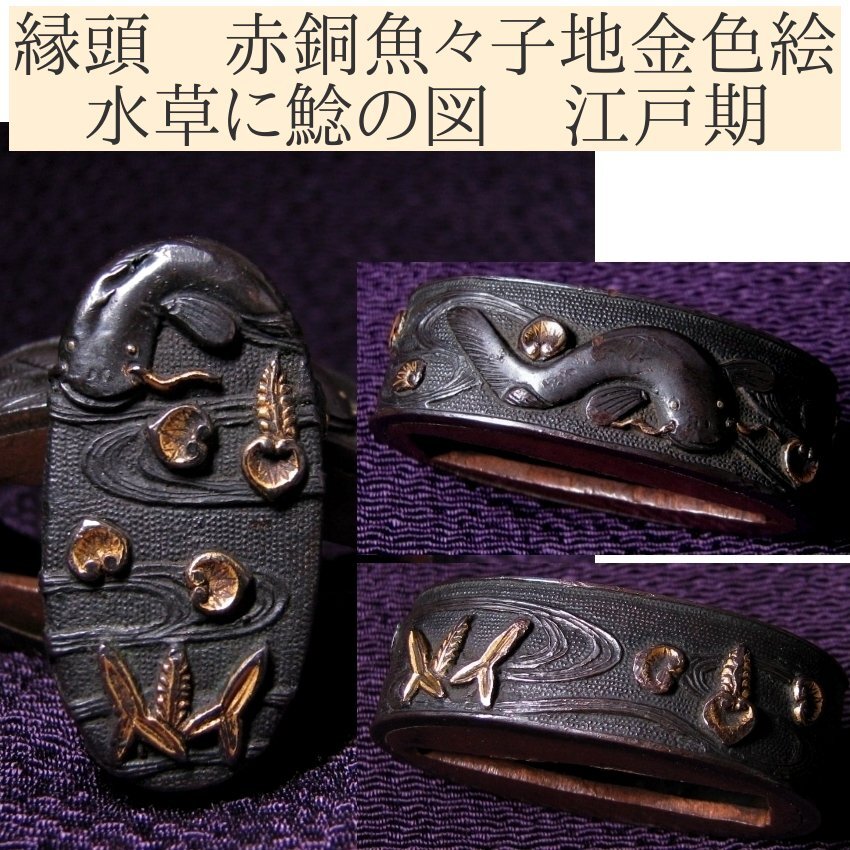 - 時代武具 縁頭 赤銅魚々子地金色絵 水草になまずの図 桐箱付 江戸時代/24k046