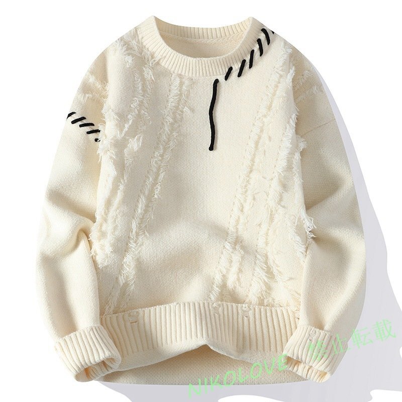 - メンズ ラウンドネック フリンジ 感 トップス カシミヤウール混 プルオーバー ニットセーター 秋冬 ゆったり M~4XL ホワイト AB211