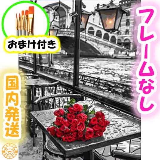 > ☆おまけ付き☆【フレームなし】 数字塗り絵 セット 大人のぬり絵 絵の具付き 白黒 バラ 街 インテリア 絵画 ジグソーパズル 油絵風 4039
