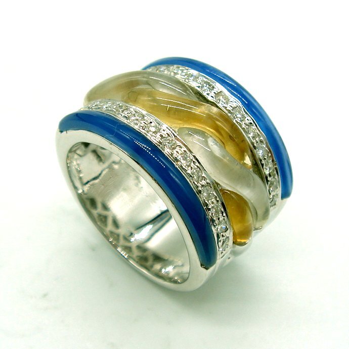 - R963:K18WG 青/白/黄水晶 ダイヤ リング(#11.5)