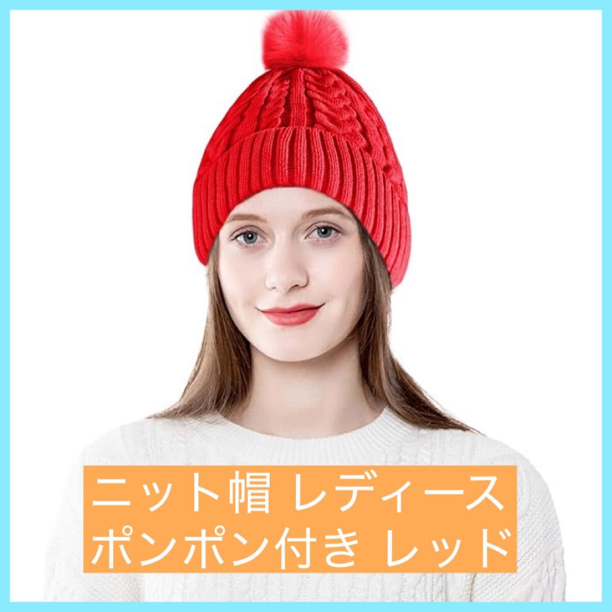 - 【大特価】ニット帽 レディース ポンポン付き 裏起毛 保温 レッド ニットキャップ