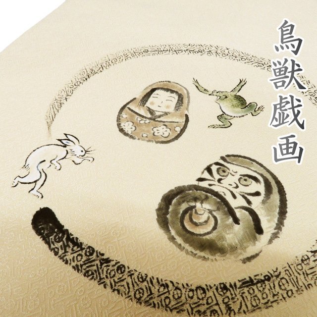 - 名古屋帯 なごや帯 中古 リサイクル 正絹 カジュアル 仕立て上がり 鳥獣戯画 地模様 福叶う 砥粉色 黒色 きもの北條 A1123-10