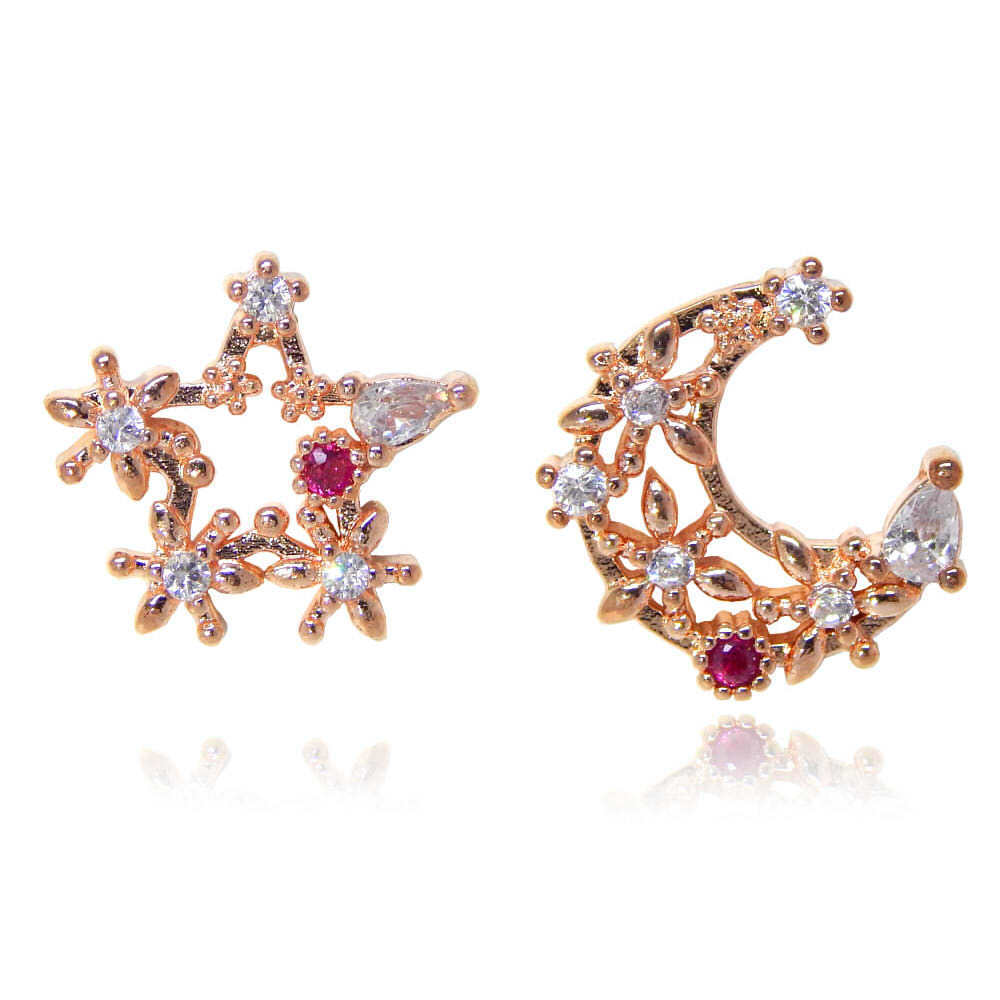 - 再入荷★新品★送料無料 フラワー月&星 CZルビーダイヤモンドピアス シルバー925 ピンクゴールド レディース ジルコニア イヤリング化可