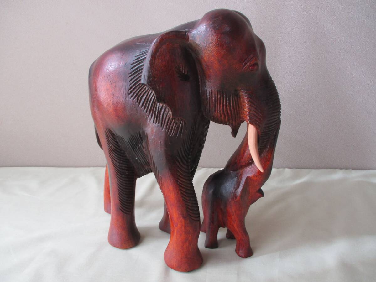 - 木彫りの親子象 : 置物・オブジェ・彫刻・ゾウ・インテリア・縁起物・木工