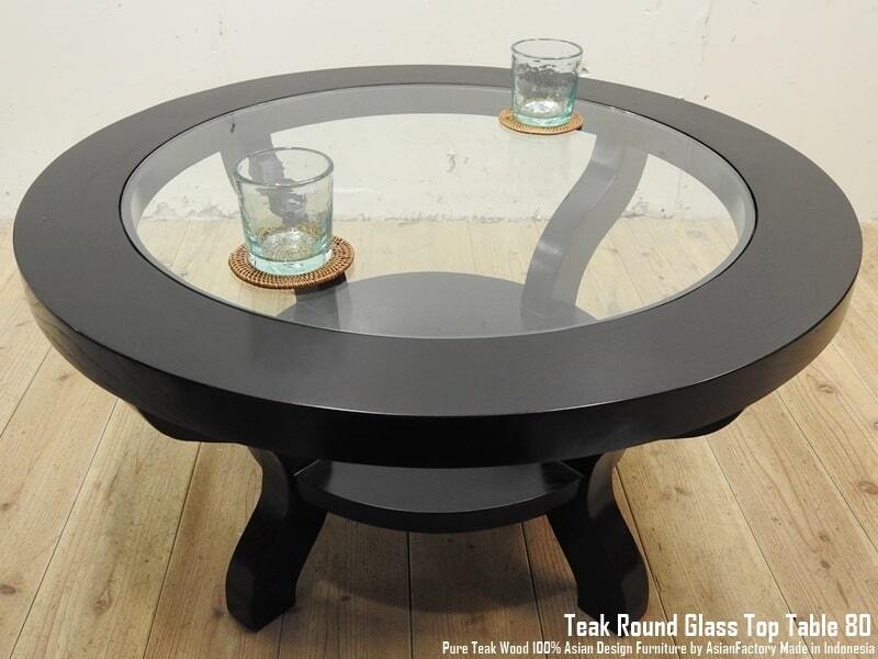 > チーク無垢材 ガラストップテーブル ラウンド 80cm ダークブラウン ラウンドテーブル 木製 コーヒーテーブル ローテーブル