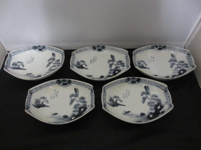 - アンティーク 有田焼 印判 染付 名あり さしみ皿 5客
