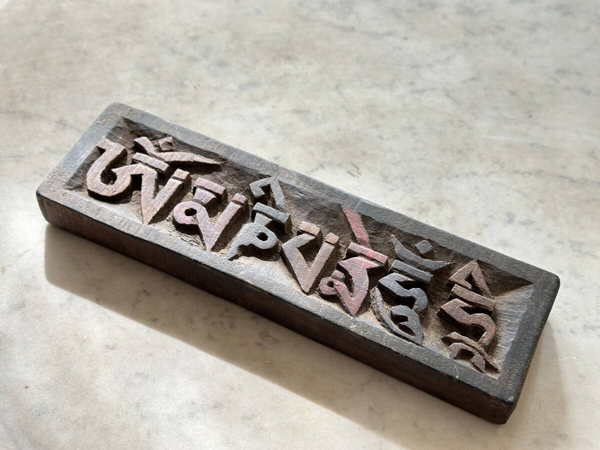 - ネパール ヴィンテージ 木彫り オブジェ インテリア 古道具 置物 真言 チベット 密教 オンマニペメフム