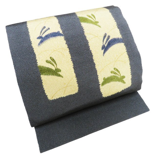 - 名古屋帯 なごや帯 中古 リサイクル 正絹 カジュアル 仕立て上がり 縮緬地 芝草に兎の図 鈍色 木蘭色 多色 きもの北條 A1127-9