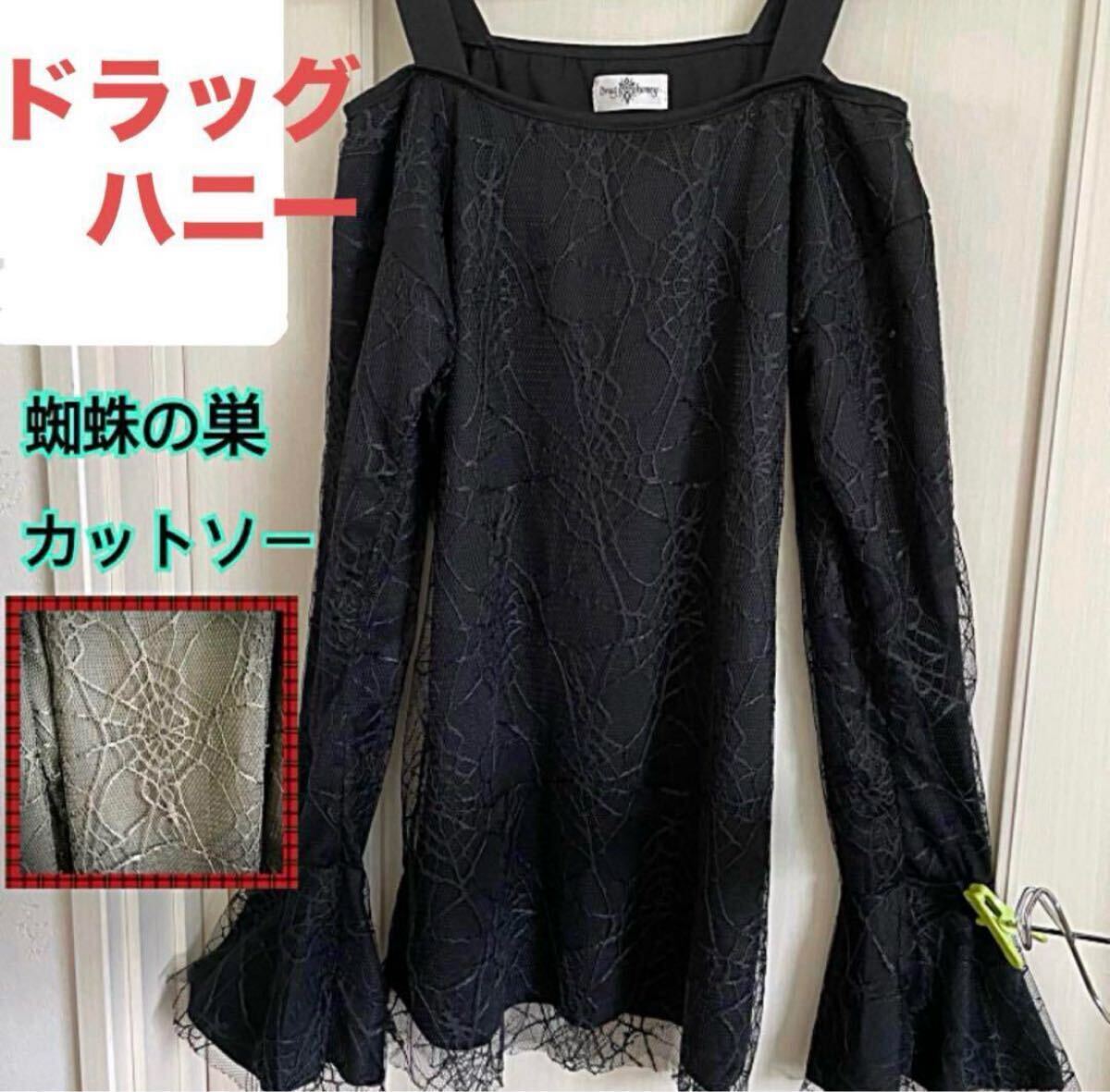 - 未使用ドラッグハニー黒Drug Honeyのカットソー オフショルダー 蜘蛛の巣 トップス カットソー ブラック