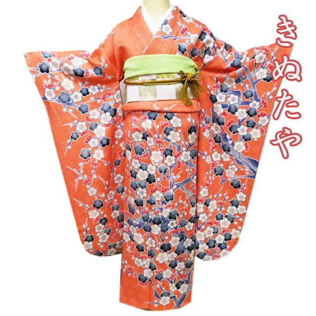 - 振袖 着物 中古 正絹 成人式 結婚式 結納 きぬたや 絞り 花模様 梅 橙系色 多色 身丈152cm 裄68.5cm SA きもの北條 A1129-7
