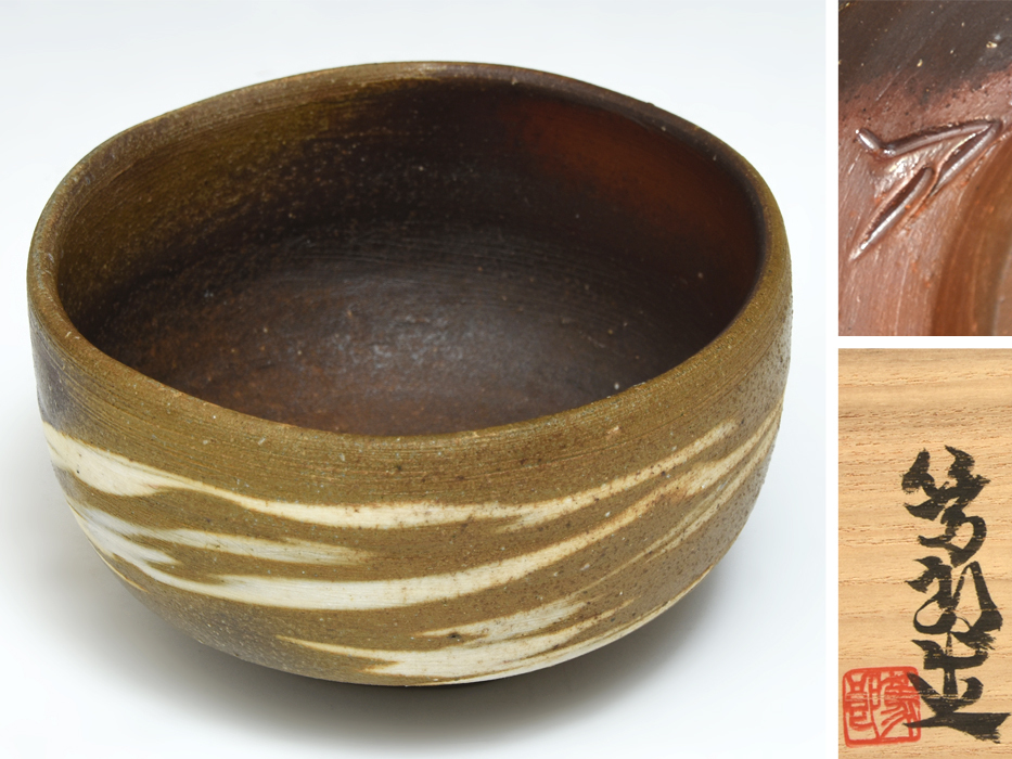 > 矢部篤郎 (造) 備前練込象嵌茶碗 共箱 共布 しおり 陶磁器 茶道具 備前焼 z9090a