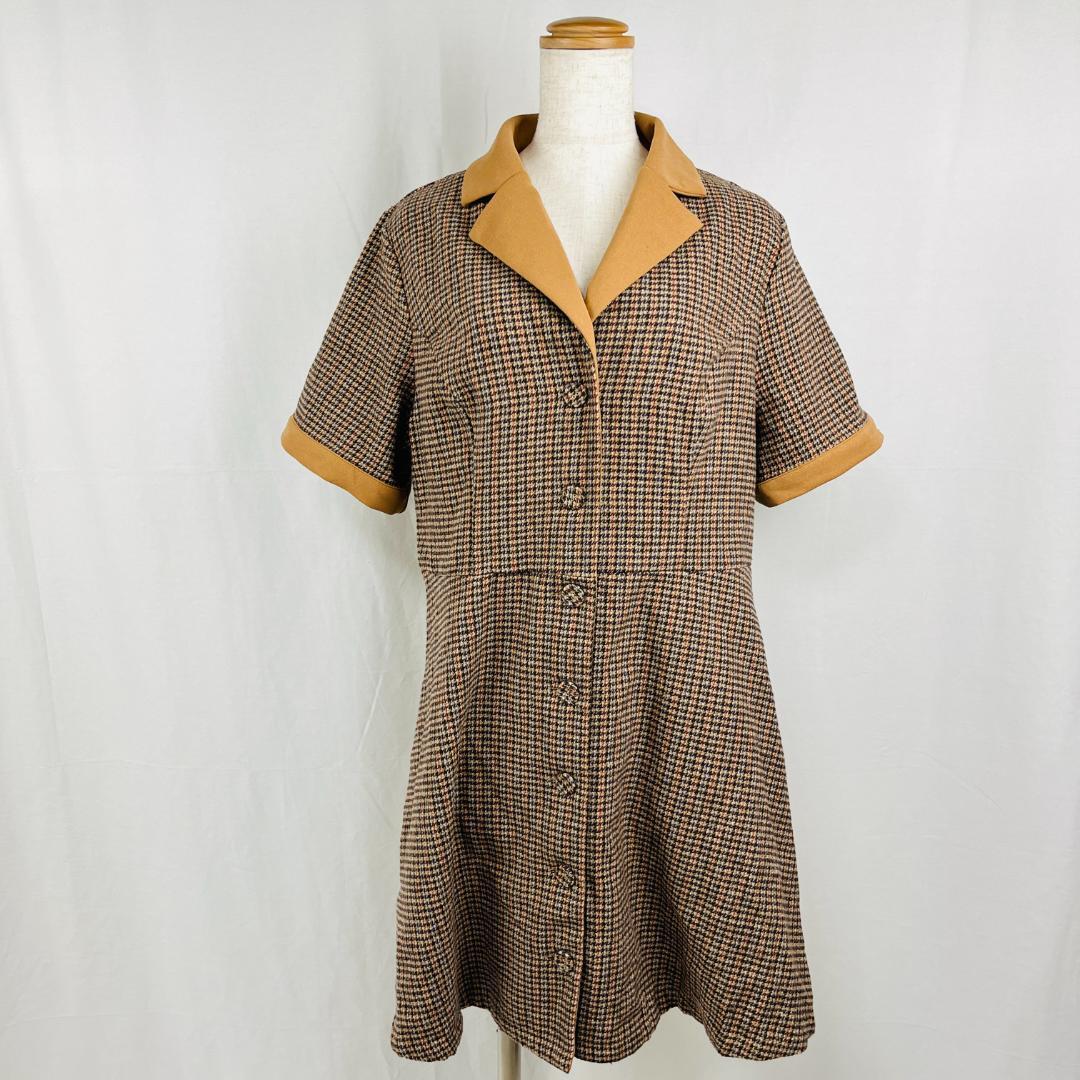 - 【2098】SHEINCURVE シーインカーブ OXL ブラウン 千鳥格子 半袖ワンピース オープンカラー クラシック 総柄 トラッド カジュアル