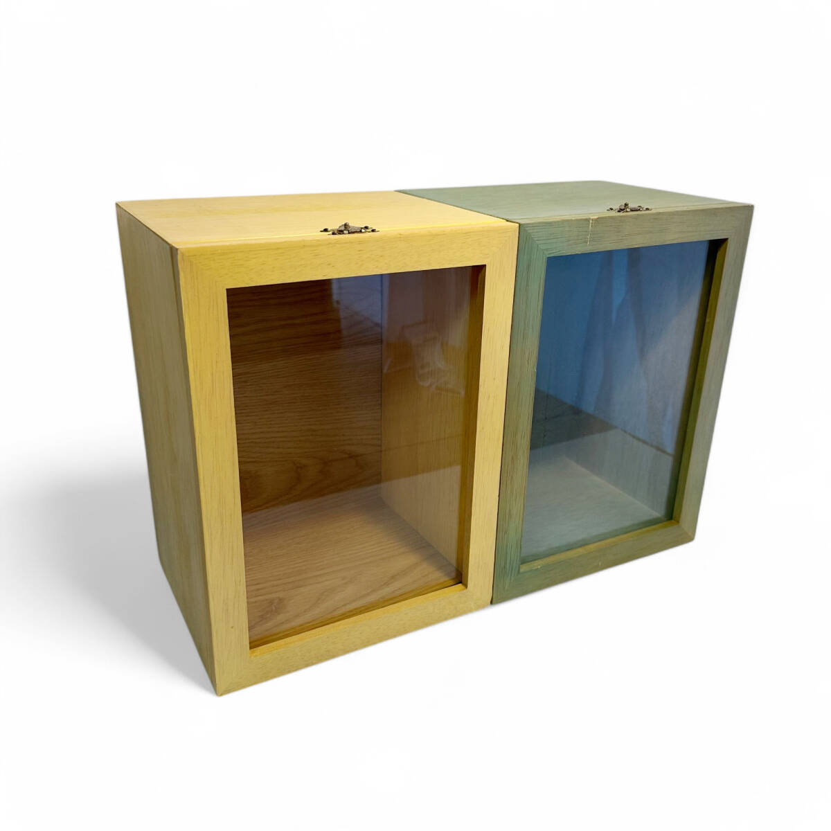 > N2394 フェリシモ 木製 飾り棚 ガラス扉付 ボックス2個セット ピンク/グリーン コレクションケース ディスプレイ
