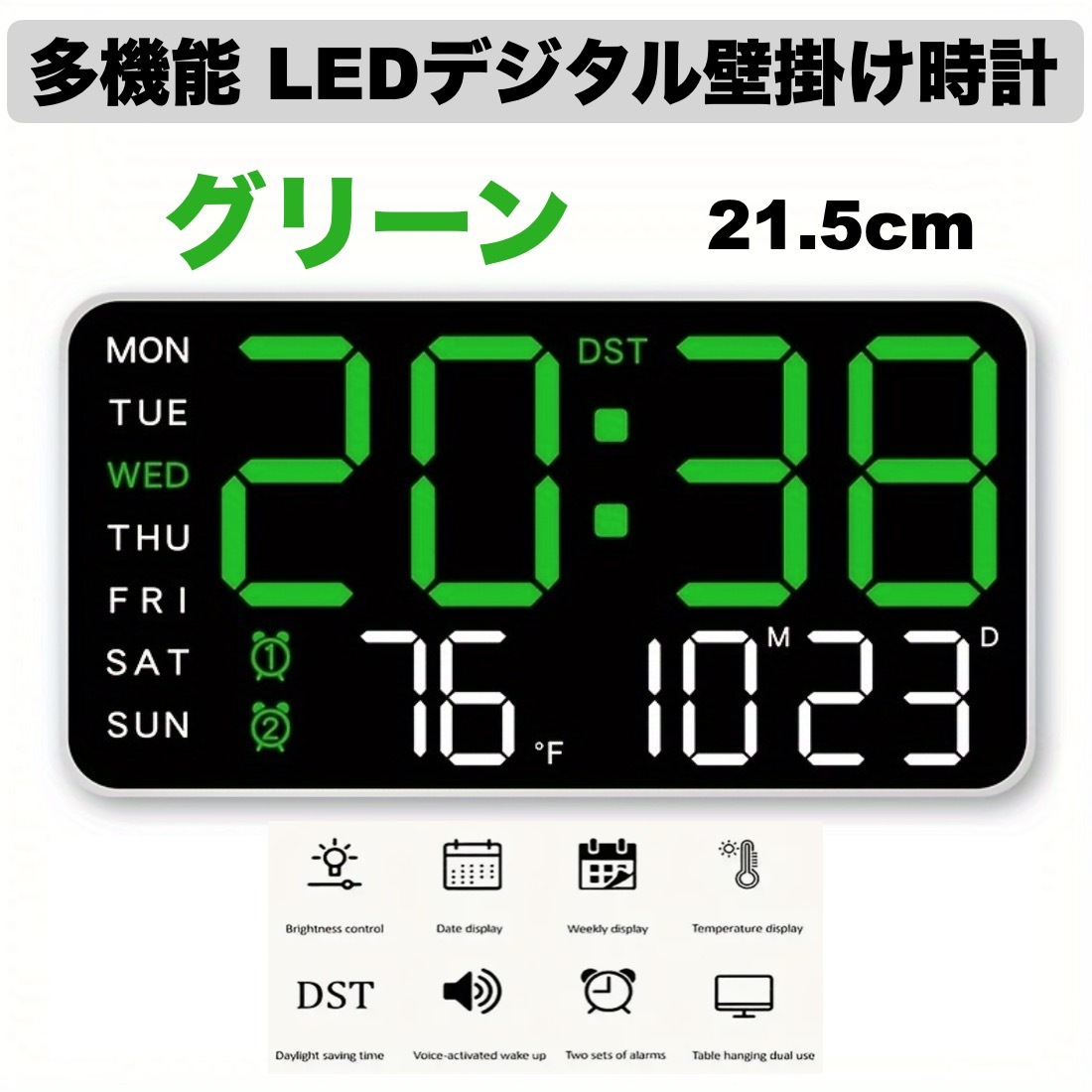 - デジタル時計 壁掛け 大型 グリーン 21.5cm 大画面 置き掛け兼用 目覚まし時計 明るさ調整 大文字 気温 日付 曜日 アラーム 見やすい t4117