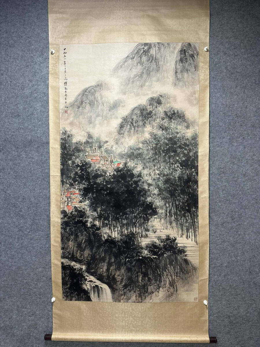 > 古美術 掛け軸 中国・近現代 「傅抱石書」 紙本 【山水図】 立軸 書道 巻き物 肉筆保証 唐物 古画 画心94×176cm LT-2412242