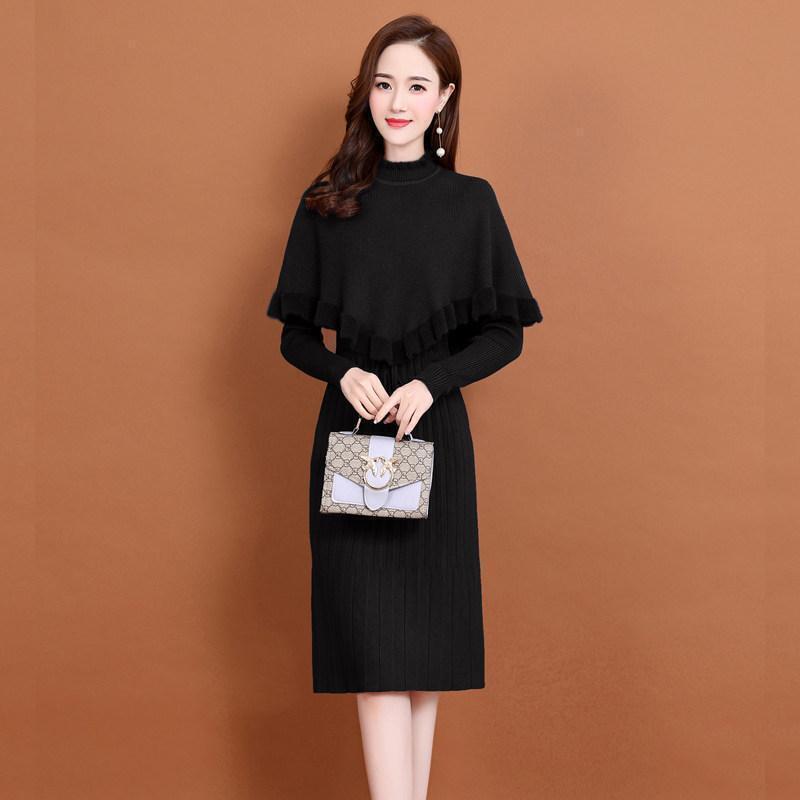 - 【ブラック色★Mサイズ】レディース ひざ丈 ニット ワンピース ストール付き