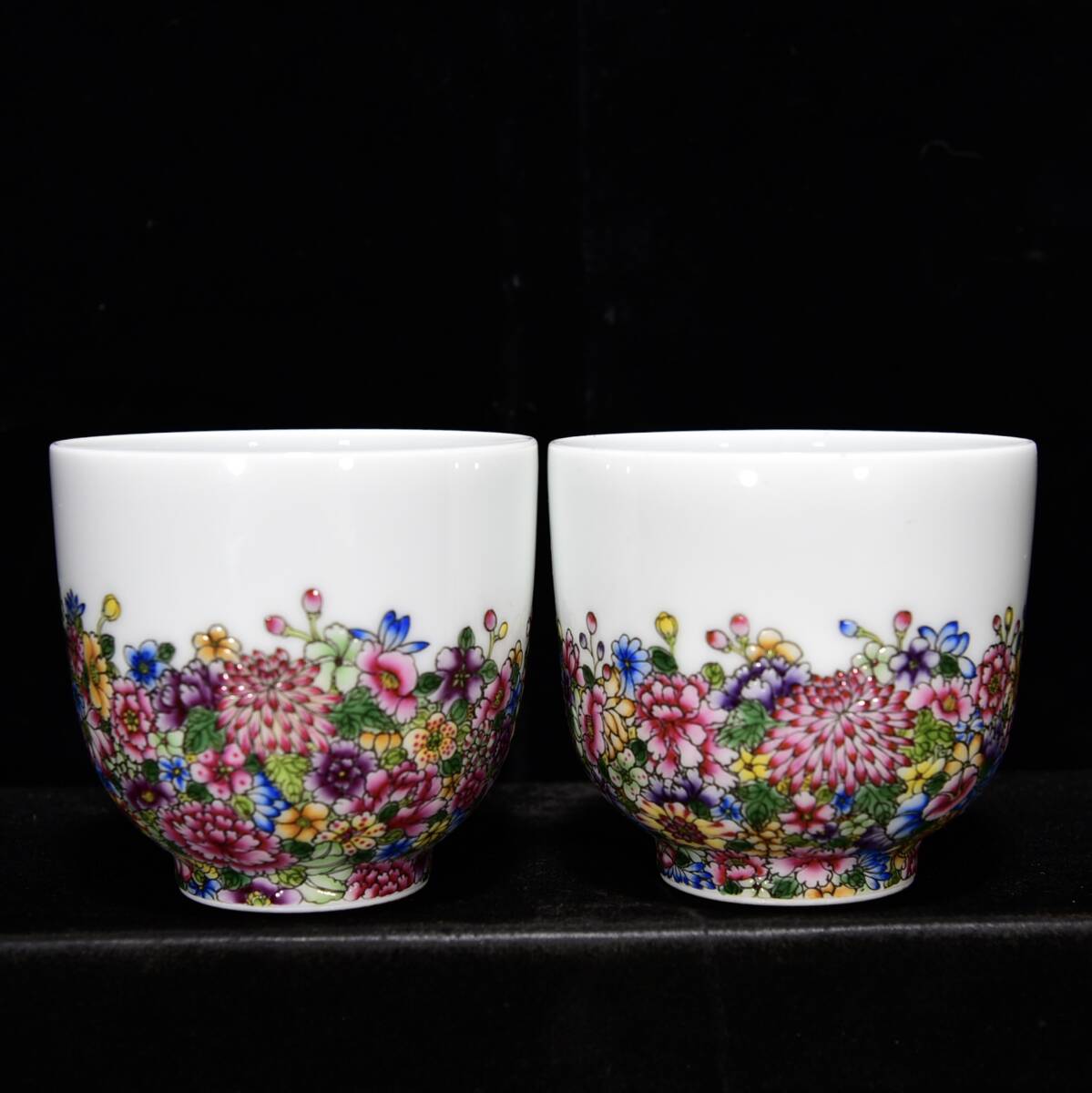 - ◆旧家蔵出◆古美術 中国古玩 大清雍正年製款 萬花彩 杯―對 置物 擺件 古賞物 擺件 骨董 時代物 A06