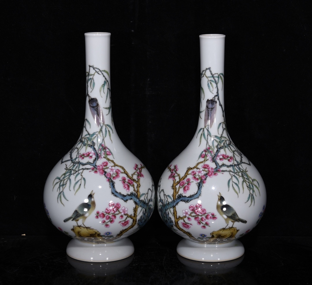 > ◆旧家蔵出◆古美術 中国古玩 大清雍正年製款 粉彩 花鳥紋胆瓶―對 置物 擺件 古賞物 擺件 骨董 時代物 A06