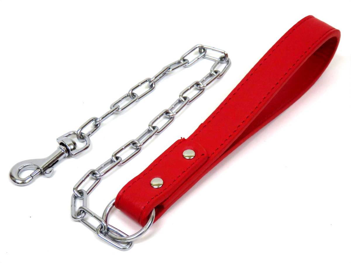 > 赤 犬用 チェーンリード 全長 65cm 持ち手幅 2.5cm チェーン幅 1cm PUレザー チェーン部 鉄 レッド ペット用品 散歩 新品 送料無料