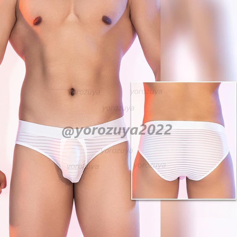 > 158-204-8 光沢 艶々ボーダー 透けシースルー ブリーフ【ホワイト,F】男性 下着 ショーツ インナー エロ アンダーウェア ゲイ マッチョ .1