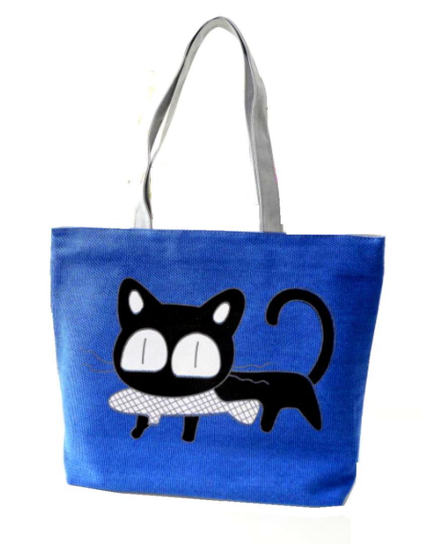 - お魚 と どら猫 トート バッグ ブルー カジュアル 帆布 ファスナー付き