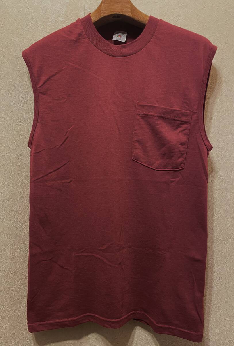 - 美品90sビンテージFRUIT OF THE LOOMノースリーブ無地ポケットTシャツMポケTエンジ系マルーン丸胴USコットン90年代フルーツオブザルーム80s