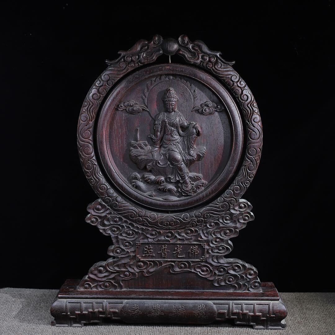 - 旧蔵 清 木材細密彫 紅木實木彫刻【仏光普照】自在觀音 仏像 圓屏風 置物 極細工 中国古玩 古美味 古董品 201-08