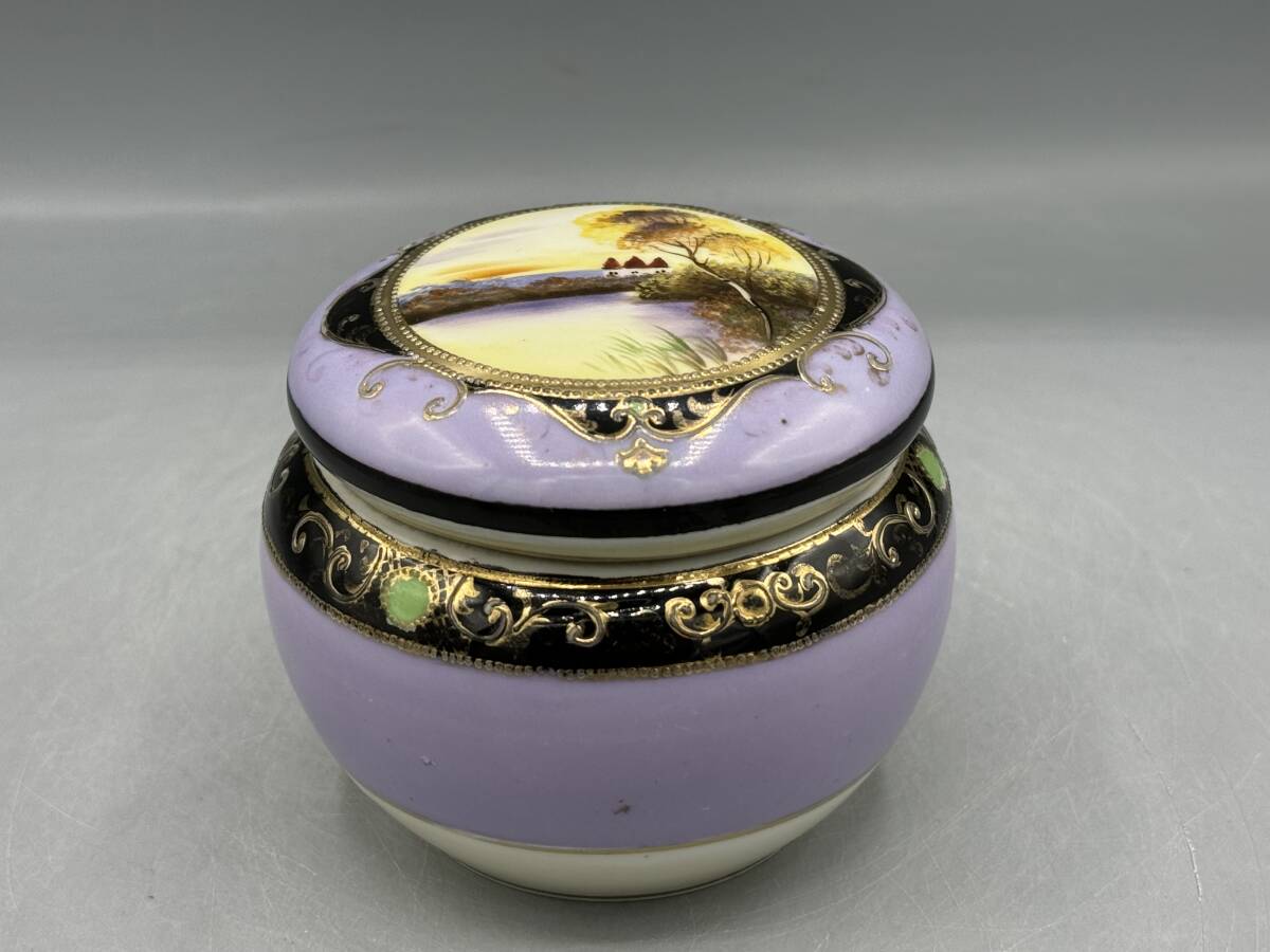 - 里帰り ノリタケ 湖畔風景画 金彩 金点盛 蓋付 小物入れ マルキ印 (771)