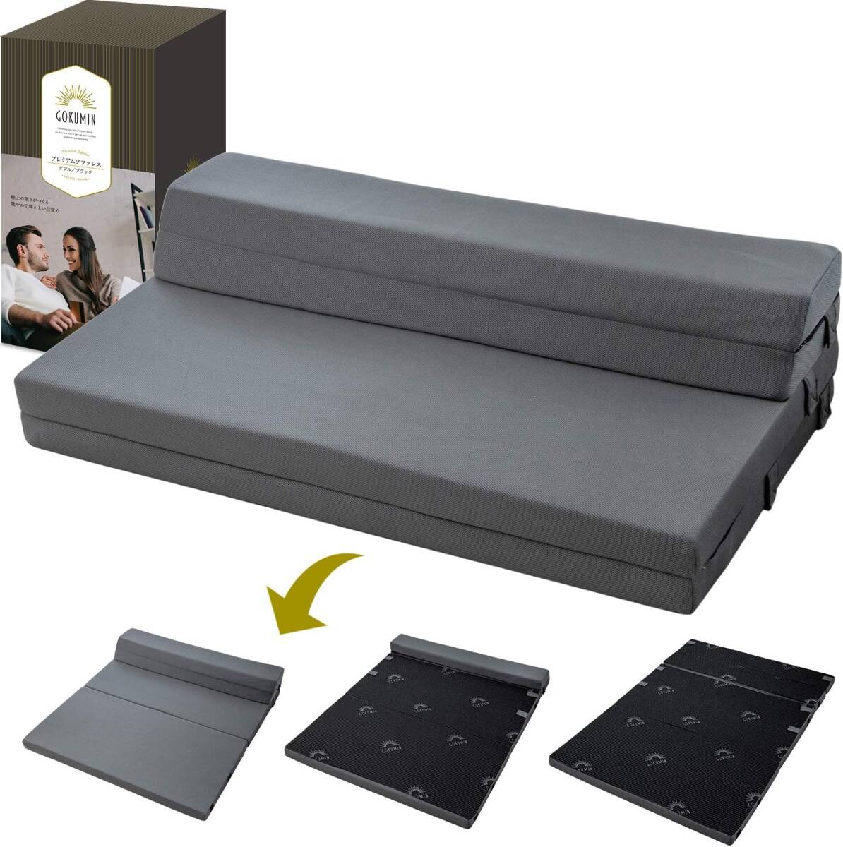> GOKUMIN 4WAY マットレス 高反発 プレミアム ダブル ブラック ソファーマットレス 厚さ8cm 折りたたみ ソファーベッド ソファ ベッド