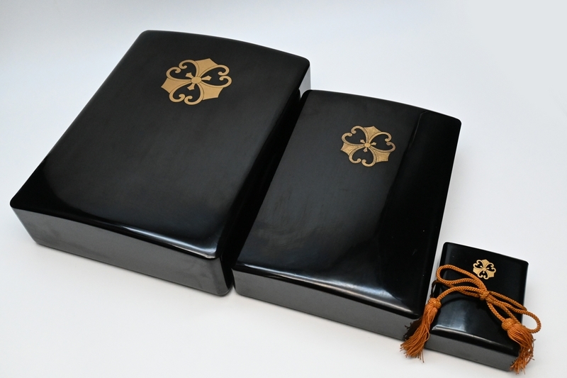 - 家紋 文箱 ■ 便利 [大中小 ] 入子 漆塗り箱 三つ組 家紋[剣に片喰] ■ 天然木 時代漆器 書道具 書簡塗箱 寺院 ■