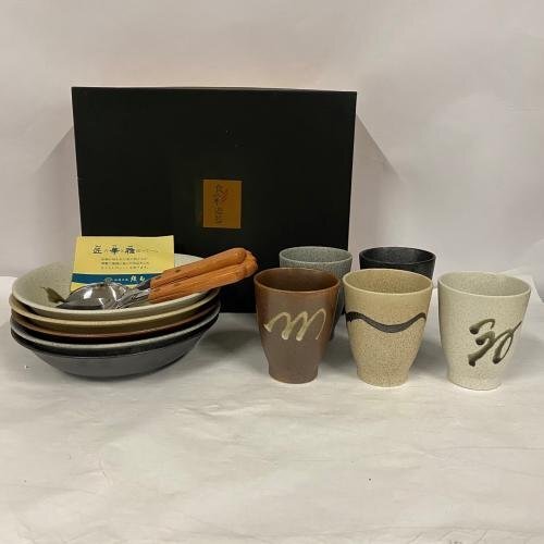 - 【保管品】伝統の器 織部 プレート グラス スプーンセット 和柄 食器 皿 コップ キッチン用品 テーブルウエア 焼物 陶器