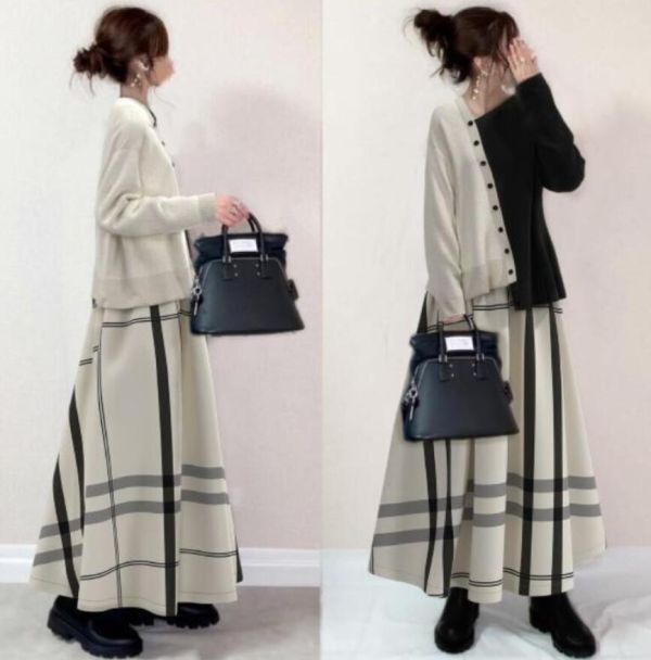 > 秋冬 /セットアップ レディース 配色 ニット トップス きれいめ ロングスカート チェク柄 長袖 上品 通勤 OL エレガント 着痩せ おしゃれ/
