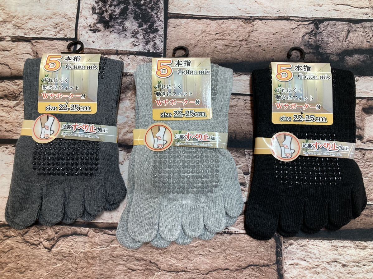 - 送料無料!『画像から3足組』安心、安全、快適!滑り止め&Wサポート付き!レディース綿混クルー丈5本指ソックス