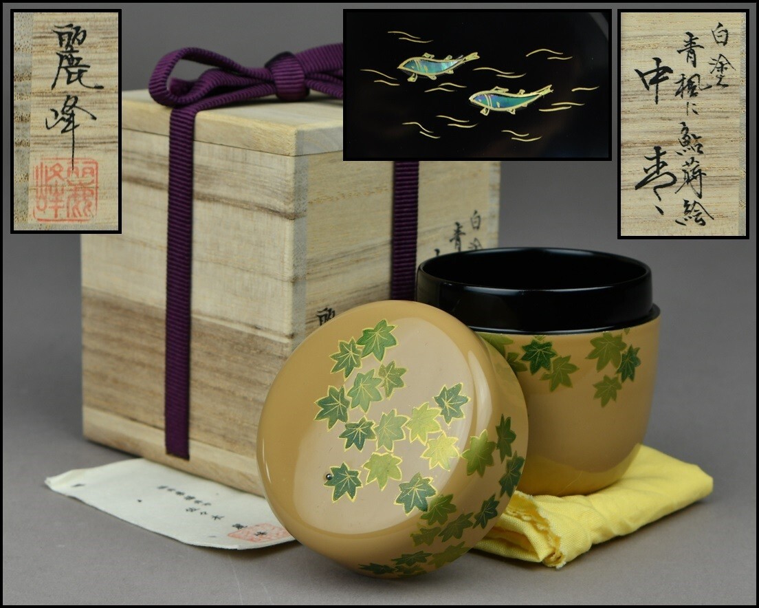 - 蒔絵師【佐々木麗峰】白塗 青楓に鮎蒔絵 中棗 布付 共箱 茶道具 YG25-0107
