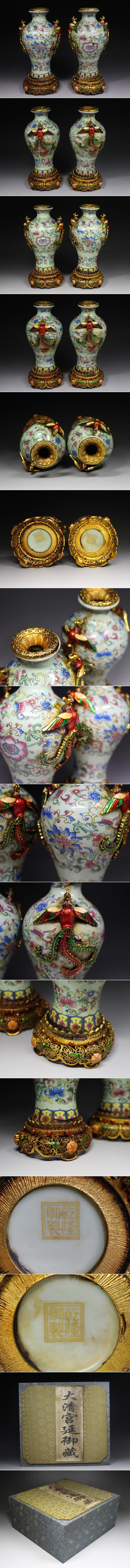 > ◆中国古玩・乾隆年製・大清宮廷藏・草花文・花瓶・一対・鳳凰双耳・細密細工・飾壷・箱付◆se138h