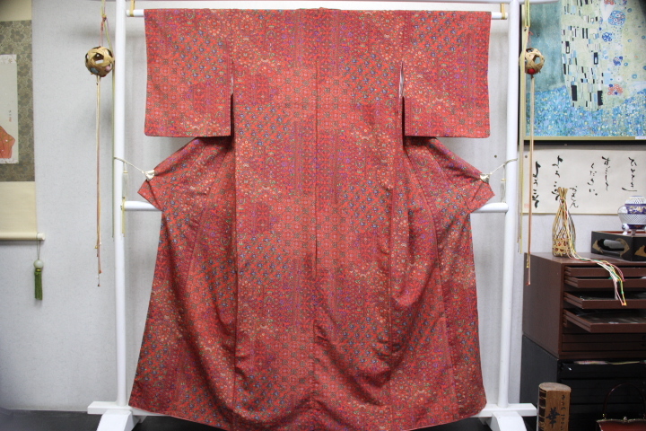 - きもの今昔8102 合繊のきもの ポリエステル100%小紋袷広衿仕立て 一越地レンガ赤色地更紗文様 身丈160cm