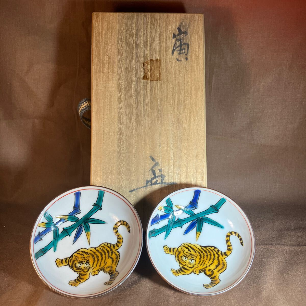 - 越田健一郎造 寅 盃 一対 九谷焼 酒器 盃 色絵 干支 ぐい呑 お猪口 酒盃 共箱