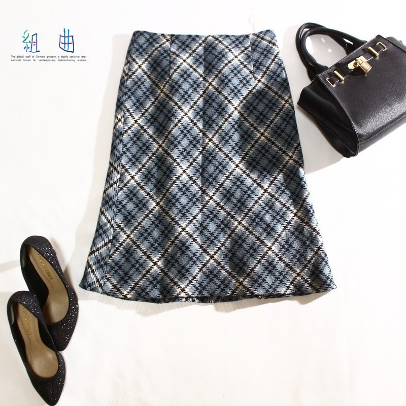 - 美品 組曲 クミキョク 株)オンワード樫山 フレア 冬 あったか チェック柄 ウール Aライン フレアスカート 9号 2 水色 通勤 オフィス 綺麗め