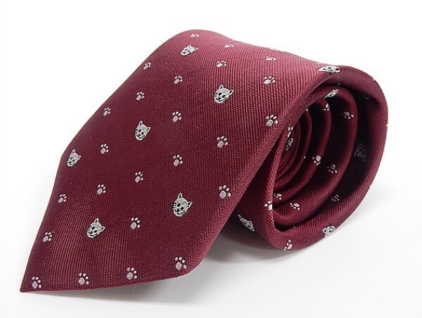 - アニマル柄ネクタイ 猫/足跡 甲州織/シルク100% ワイン/小紋 日本製 ANK02