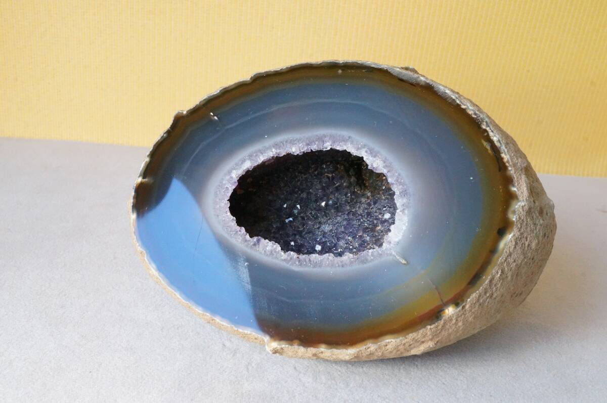 - 希少!昔の在庫!縞模様が綺麗な上質ブラジル産特大瑪瑙 中はアメジスト・メノウ・めのう・メノー ジオード【表面研磨原石】2.1g