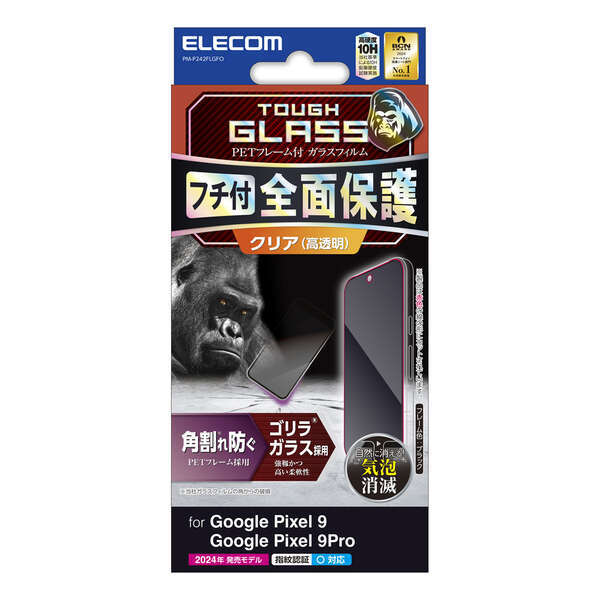 > Google Pixel 9/9 Pro用画面保護ガラスフィルム フレーム付/Gorillaガラスタイプ 3D設計PETフレームで角割れを防ぐ: PM-P242FLGFO