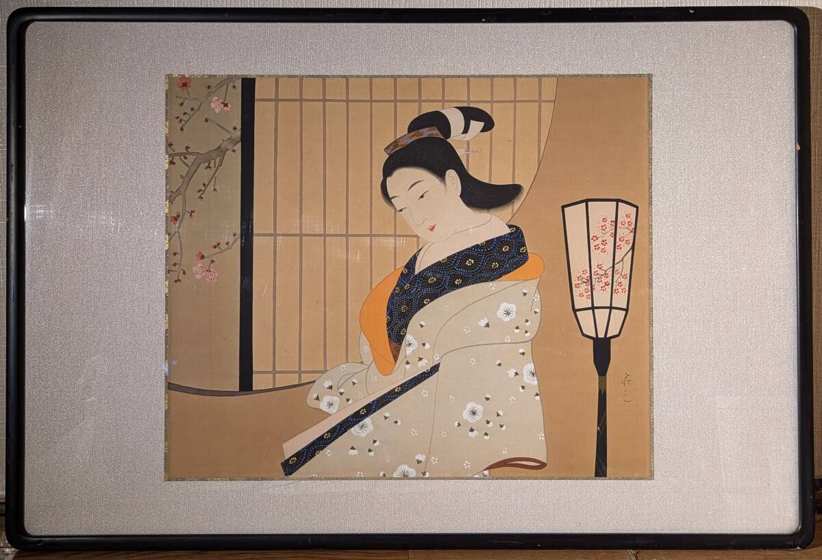 - 【真作】絵画 日本画 美人画 和装の女性と情緒あふれる灯籠の情景 V80