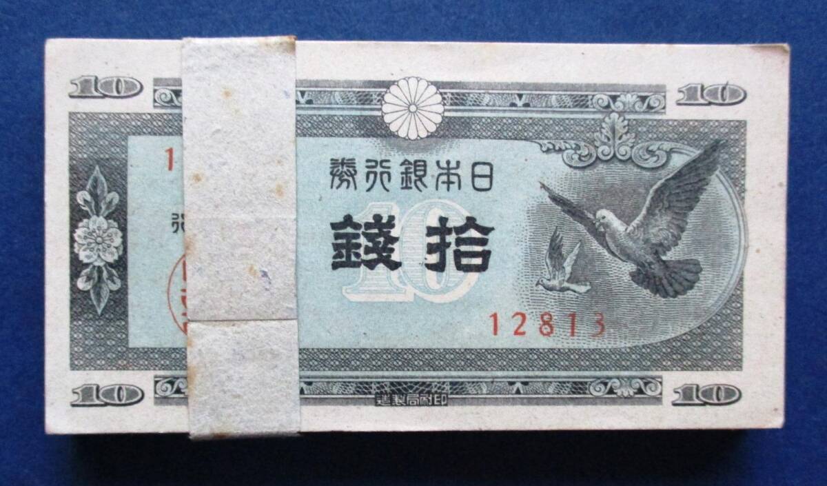 - 希少品 日本紙幣 日本銀行券A号10銭 ハト10銭 帯封ピン札100枚 EE35 ほぼ美品です。家の家宝にしませんか。 画像参照してください。