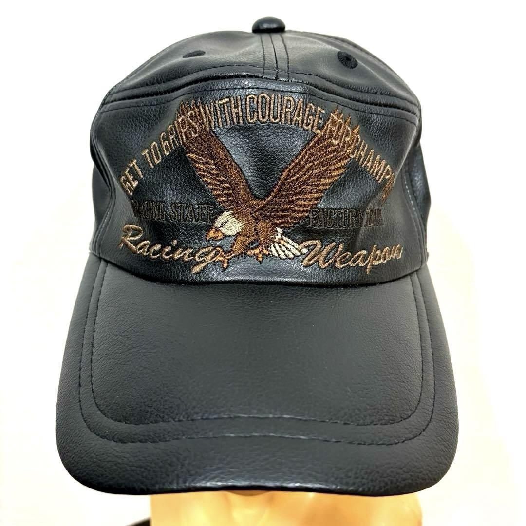 - 極美品 林八百吉 黒 ブラック 耳付き 耳当て レーシング キャップ 刺繍 帽子 合皮 フェイクレザー 古着 y2k 00s ライダー レーサー アポロ