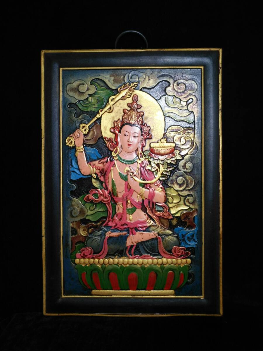 - 旧蔵 チベット漆器 楠木 彩色ドンカ 『文殊菩薩』 極細工 中国古玩 古美術 骨董品 201-23