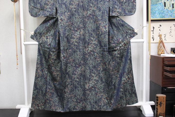> きもの今昔8135 ウールのきもの 広襟セブセ付き単衣手縫い仕立 濃紺色地草木の柄 極めて良い状態の品 身丈159cm