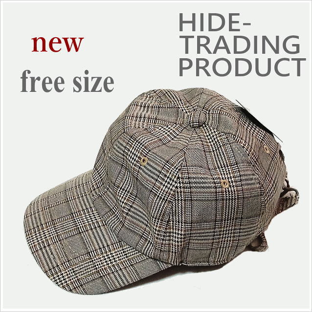 > 未使用[HIDETRADING] 茶ベージュ系グレンチェック柄バックレースアップキャップ 帽子 ヒデトレーディング レディース ◎送料込み
