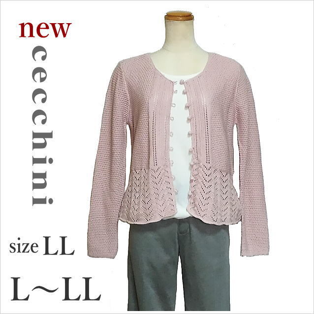 - 未使用[cecchini]ピンク透かし編みニットカーディガン トップス 長袖 羽織り レディース L~LL位 *送料込み